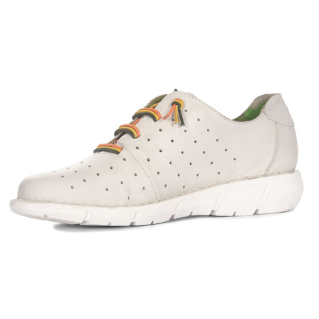 P6811-11-00-1Maciejka Women's Leather White Half-Shoes are a great choice for those looking for a combination of elegance and comfort. Made of natural leather, they offer softness and breathability, making them ideal for warmer days. Thanks to the flat heel and closed front with a round toe, the half-shoes provide comfort at every step. Elastic laces allow for easy adjustment, and the natural leather inside the footwear ensures comfort all day long. The white color with the addition of colorful elements goes great with summer clothes, adding style and lightness. These half-shoes are part of the spring-summer 2025 collection by Maciejka, which combines modern design with functionality. Perfect for everyday, summer walks.