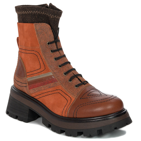 05624-08/00-7Original leather women's shoes and boots by Maciejka are unique footwear that wins the recognition of many women regardless of age. This is a proposition that meets the highest standards of quality, comfort and style. The upper of these boots is made of high-quality natural grain leather and suede in warm shades of brown and intense red, which gives the footwear a unique character. The manufacturer's color - red - adds originality to the shoes. This model is characterized by a comfortable and functional fastening in the form of a tie, which allows the shoes to perfectly fit the foot. Additionally, a sewn-in zipper on the inside makes it easier to put on and take off the shoes. The inside of the shoe and the insole are made of a soft and pleasant to the touch fabric, which guarantees wearing comfort. The boots are not additionally insulated, which makes them an ideal choice for different seasons. The thick, non-slip platform sole with a height of 6 cm under the heel and 2.5 cm at the front ensures stability and additional comfort when walking. This model goes well with both trousers and casual outfits, adding character and style to any styling. These shoes were made in Poland, which is a guarantee of high quality workmanship and materials (Quality: I). These are footwear that perfectly reflect the spirit of the Polish brand Maciejka, whose products are recognized on the footwear market.